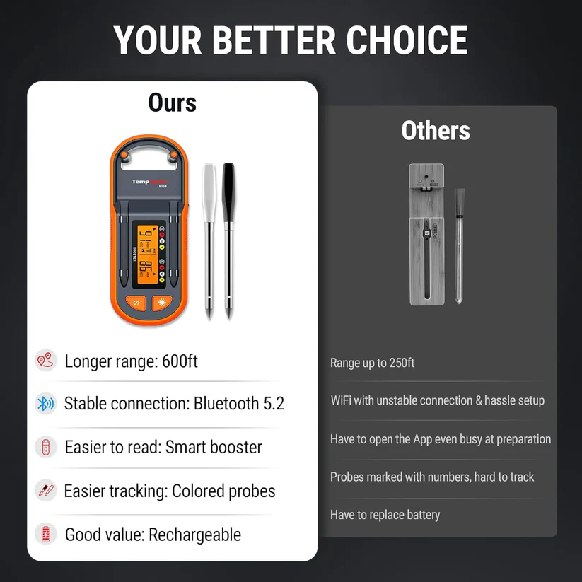 - Bluetooth 5.2 með allt að 600 fet (180 m) drægni – Fylgstu með hitanum langt frá grillinu, ofninum eða reyknum án truflana.