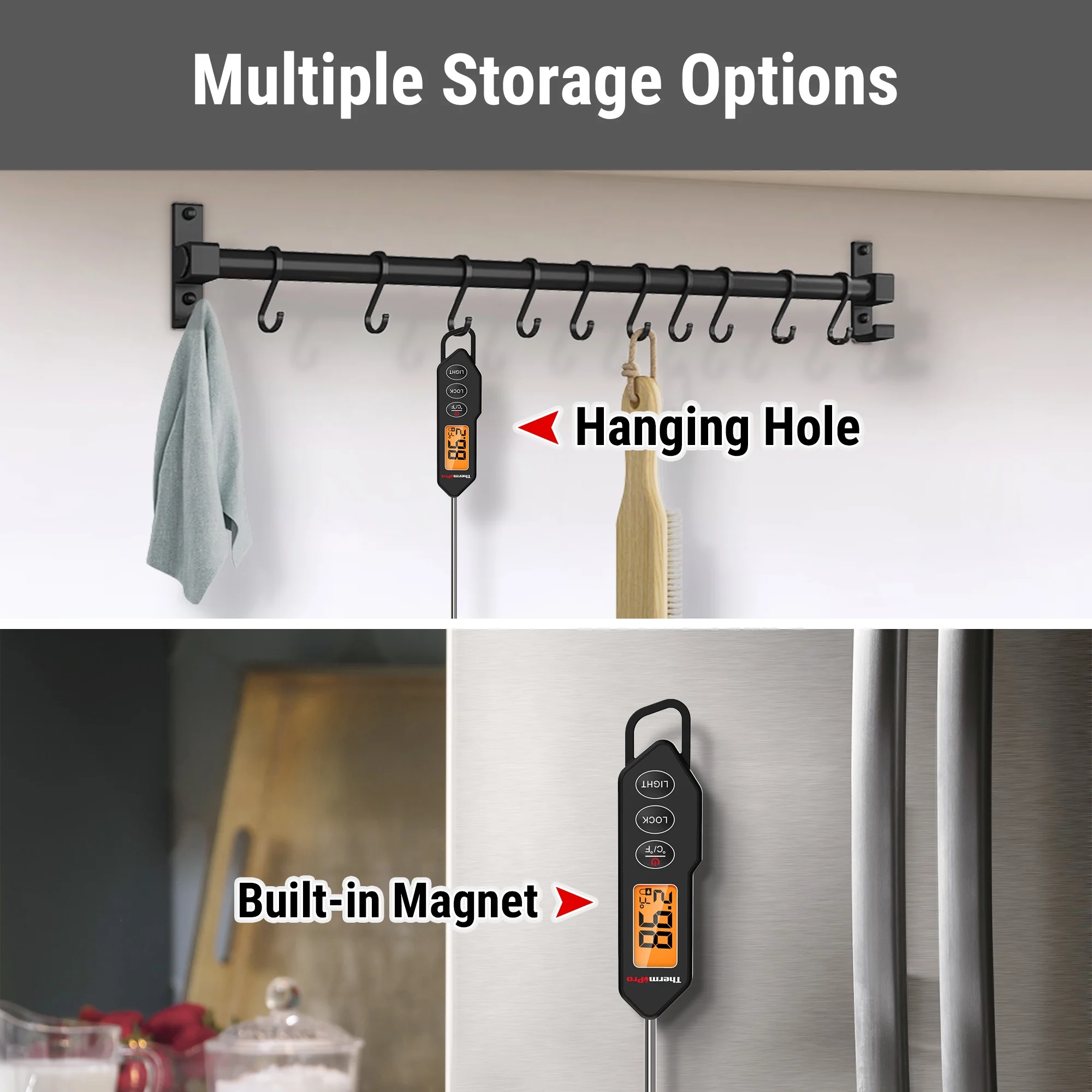 Þægileg geymsla og fjölhæfni: Hægt er að hengja hann upp, nota segul á baklið eða leggja í skúffu, og er því auðvelt að geyma mælinn. Hægt er að skipta milli °C og °F. Rafhlöður fylgja með til notkunar strax.