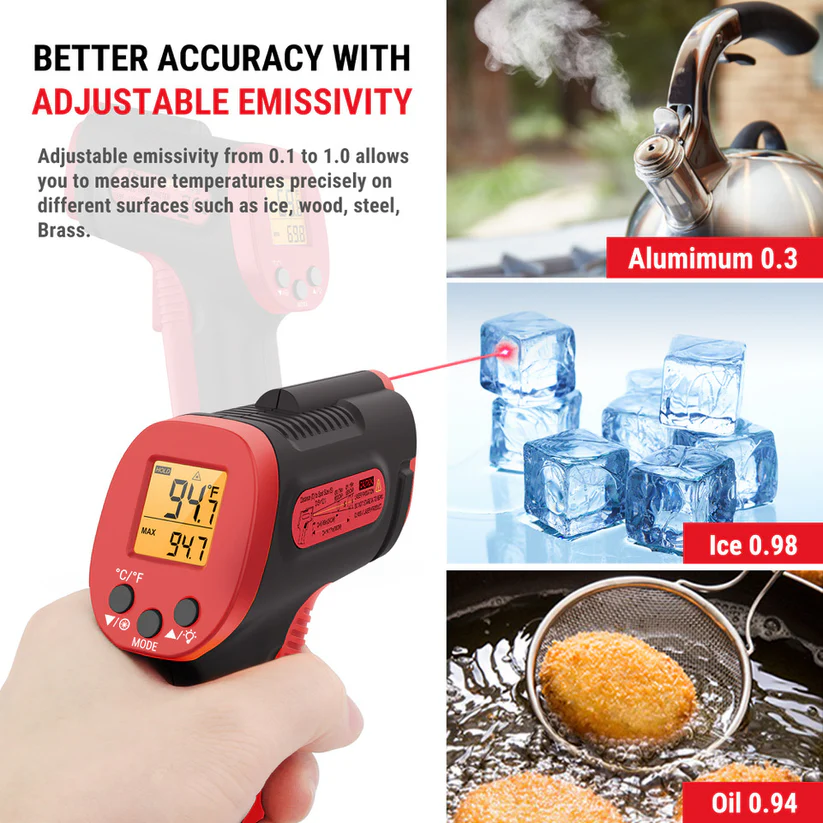 Öflugur innrauður hitamælir sem mælir yfirborðshita án snertingar, hratt og örugglega. Tilvalinn í eldhús, bílskúr, verkstæði og heimilisviðgerðir.