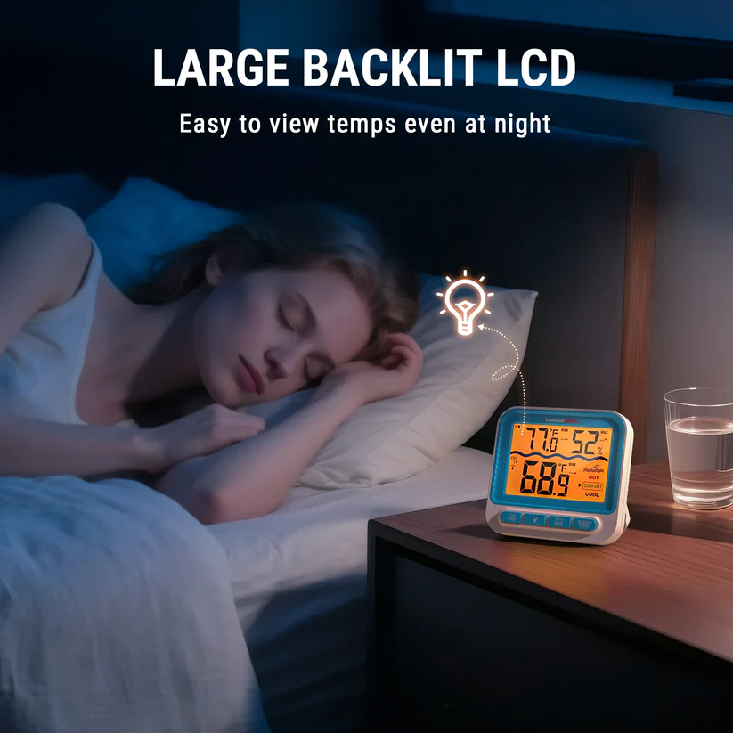 - Stór, baklýstur skjár – Skýr og stór tölustafir sem sjást vel, jafnvel í myrkri. Sýnir einnig hæsta og lægsta hitastig síðustu 24 klst. svo þú fylgist með breytingum yfir daginn.
